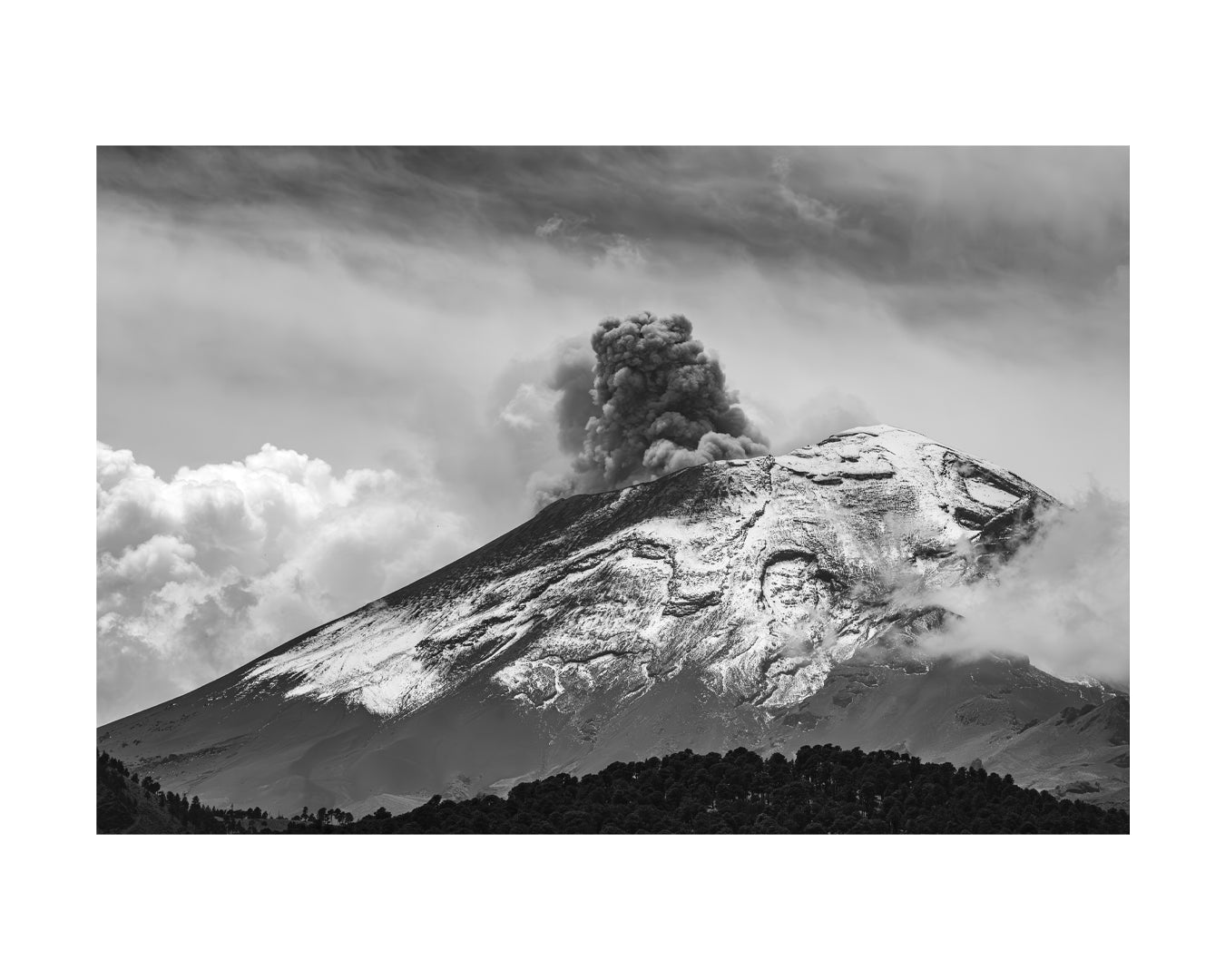 This print captures the raw majesty of the Popocatépetl, freezing the moment where telluric power meets the serenity of eternal snow. The black-and-white treatment intensifies the textures, from the plume of ash to the pine forests, transforming the Mexican volcanic landscape into a graphic study of contrasts and light, between earth and sky.