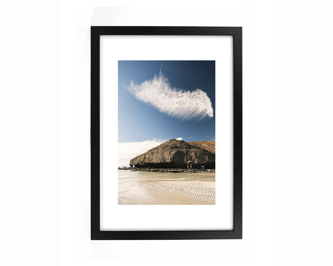 Erosion. This rock has been there for centuries, indifferent. The cloud above it, by contrast, is nothing more than an accident of vapor that will have vanished within the hour. The sand retains the mark of the receding tide, damp and compact. It is an unequal encounter between what remains and what passes. The landscape does not need a spectator to exist; it simply endures time and wind.